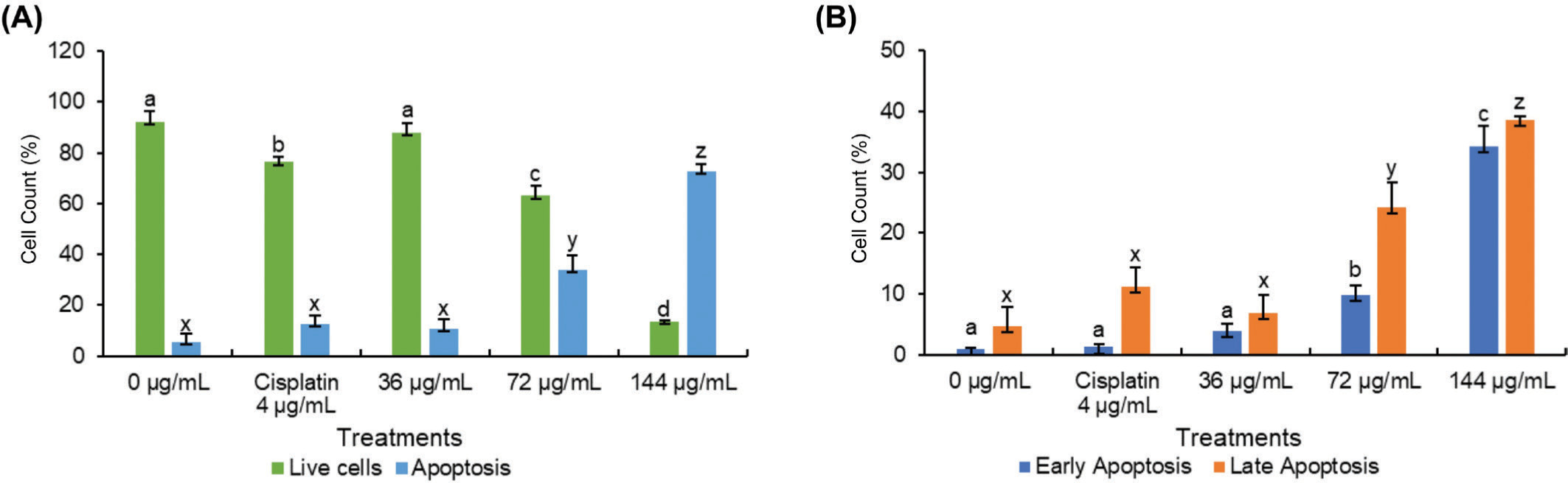 The flow cytometry analysis determines the total number of viable, apoptotic, and necrotic cells. The data were represented in a quadrant plot of flow cytometry gating analysis (A) and a bar chart based on the gating results (B). The mean ± standard deviation was used to present the value. The statistical significance of Tukey analysis at a 95% confidence level is denoted by different alphabetical notation for each parameter.