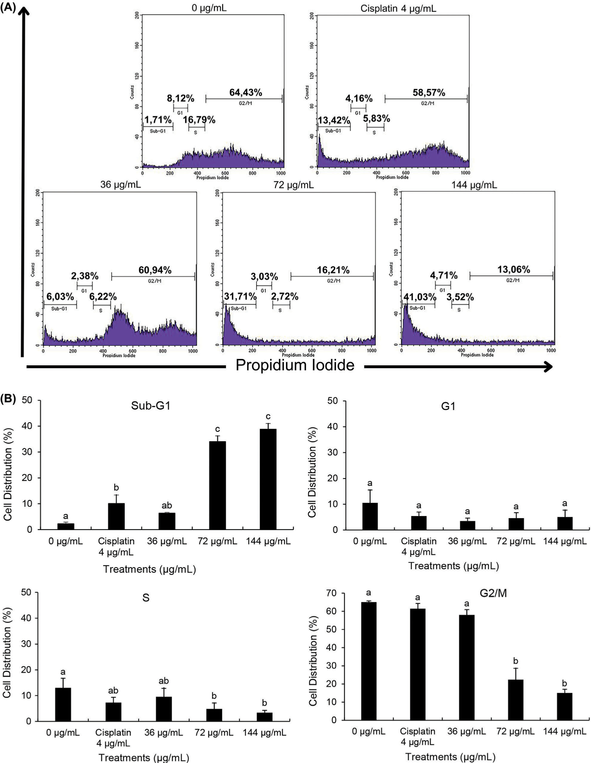 The profile of cell cycle in T47D after BEE treatments according to flow cytometry analysis. (A) Flow cytometry histogram and (B) bar chart and statistical analysis from flow cytometry histogram. The value is presented as mean ± standard deviation. The differences in letter labels indicate a significant different at 95% confidence interval.
