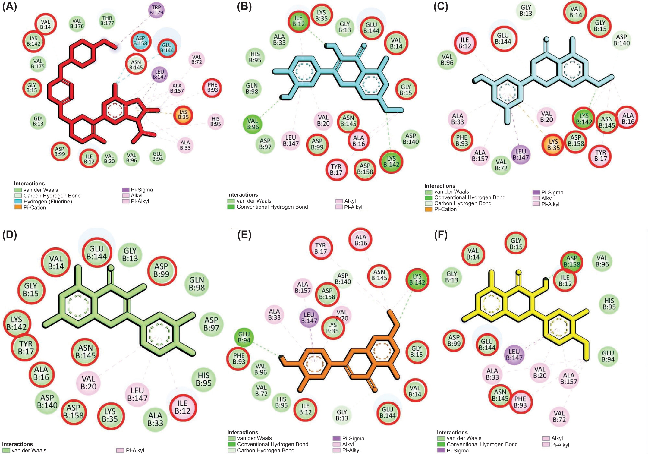 Molecular interaction of CDK-4 with control and selected compounds. (A) CDK-4/Abemaciclib (control), (B) CDK-4/Rhamnetin, (C) CDK-4/Blumeatin, (D) CDK-4/Quercetin, (E) CDK-4/Luteolin-7-methyl ether, and (F) CDK-4/Taxifolin 4’-Methyl ether. The residues highlighted with red circles denote their involvement in the active site of CDK-4.