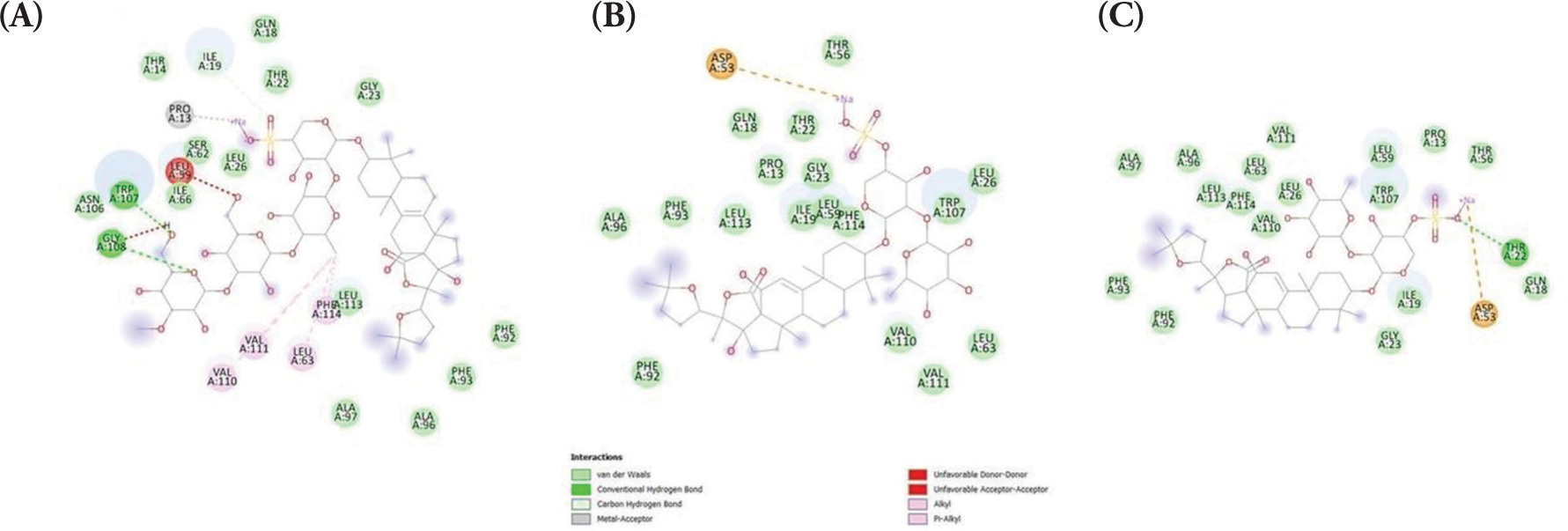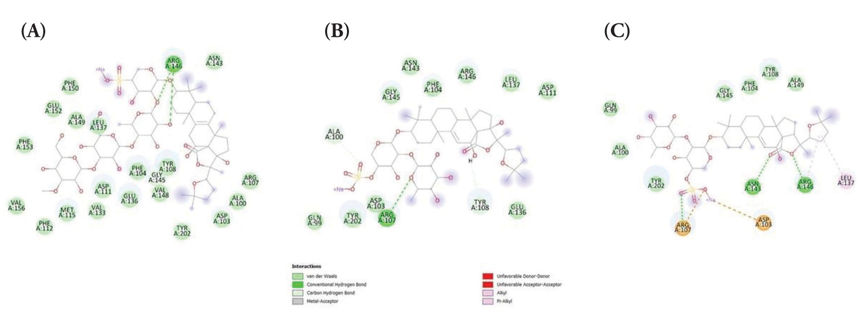 The binding affinity of BCL-2 protein with (A) Holothurin A (ΔG = −8.732 kcal/mol); (B) Holothurin B (ΔG = −7.757 kcal/mol); (C) Holothurin B3 (ΔG = −8.356 kcal/mol).