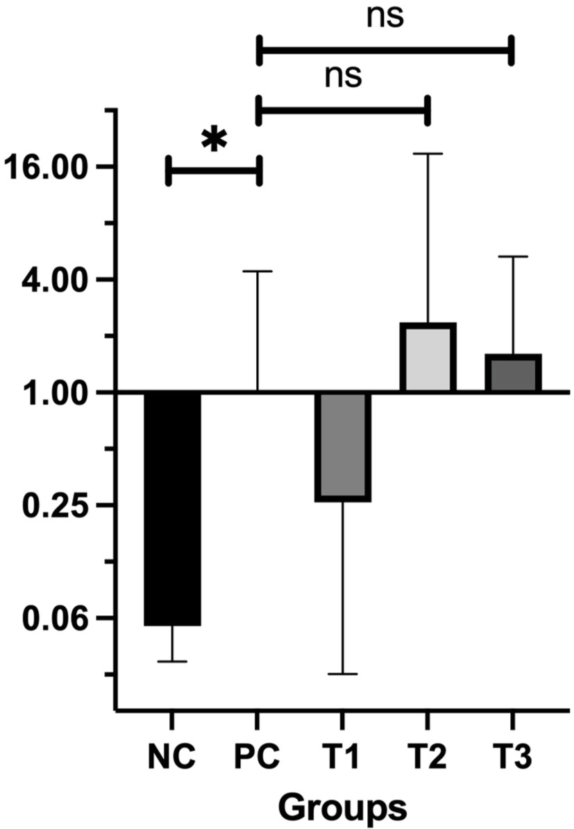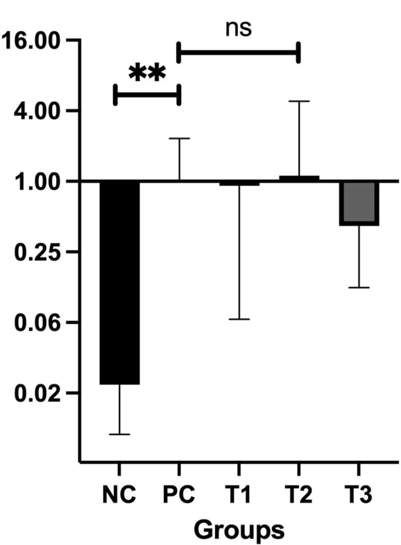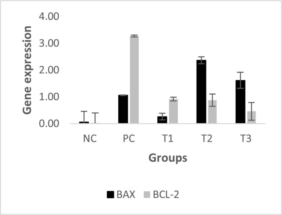 Bax, located on chromosome 19q13.33, plays a pivotal role in promoting apoptosis, specifically through the intrinsic mitochondrial pathway. Bax facilitates apoptosis via promoting the release of cytochrome C from mitochondria, which in turn triggers the caspase cascade, responsible for programmed cell death. This mechanism serves a key role in eliminating potentially cancerous cells (Cavallo et al., 2011). The relative Bax mRNA expression levels in the treatment groups (T1, T2, T3) compared with the PC group are shown in Figure 3.