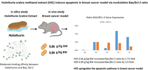 Given the historical use of sea cucumbers in traditional medicine and their emerging scientific relevance, Holothuria scabra represents a promising source of therapeutic agents from nature. In this context, this study aimed to explore its anticancer potential through the apoptosis pathway more systematically using modern bioinformatics and experimental tools as new treatment strategies for breast cancer.