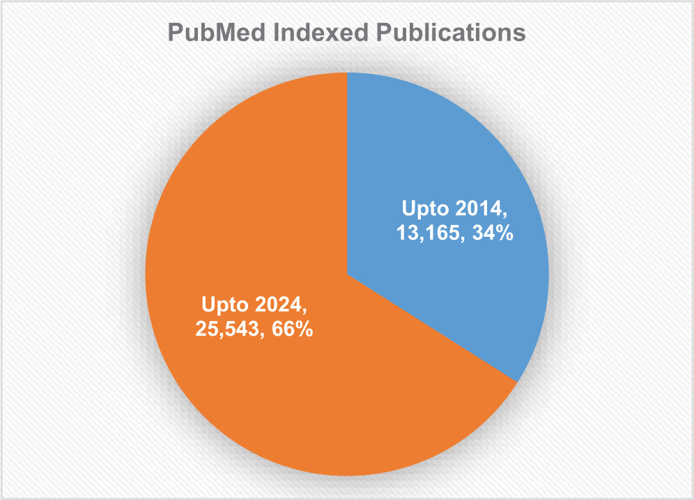 There is a sharp increase in the number of publications from Ayush researchers. The total number of publications related to Ayush on PubMed was 13,165 until 2014, while this number was almost doubled and reached to 25,543 in 2024 (Figure 2).