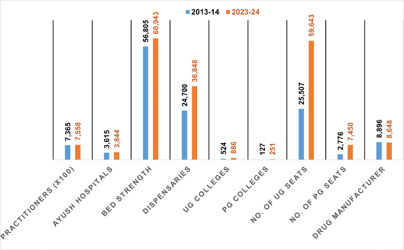 Ayush infrastructure has consistently increased during the last decade in terms of Ayush healthcare centers, healthcare providers, and the number of UG and PG colleges, as depicted in Figure 3 (Anonymous, 2024).