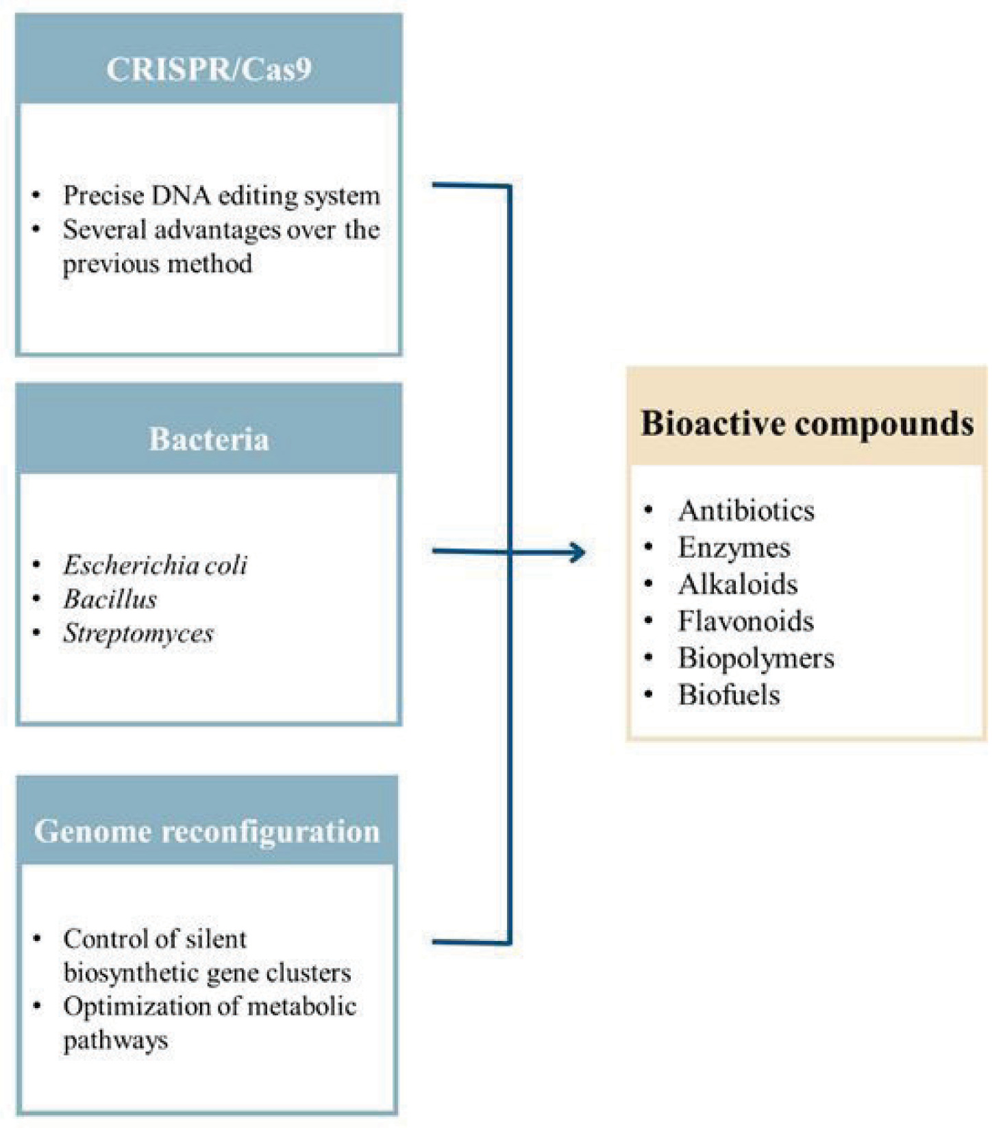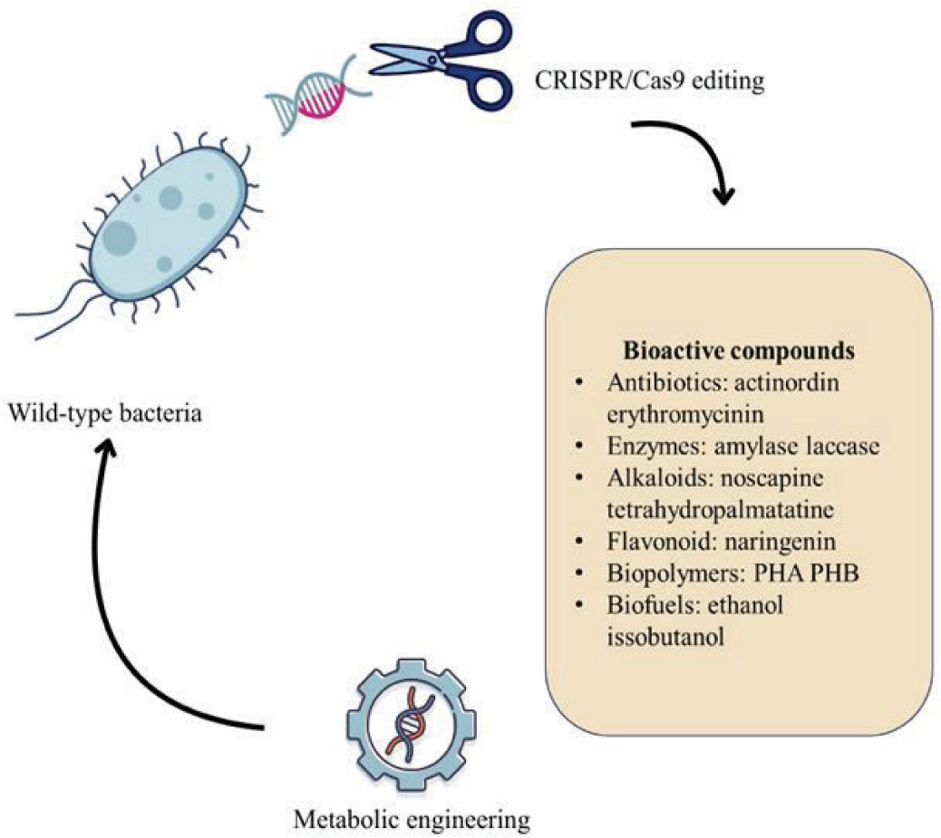 Application of CRISPR/Cas9 technology in bacterial gene restructuring to produce bioactive compounds.