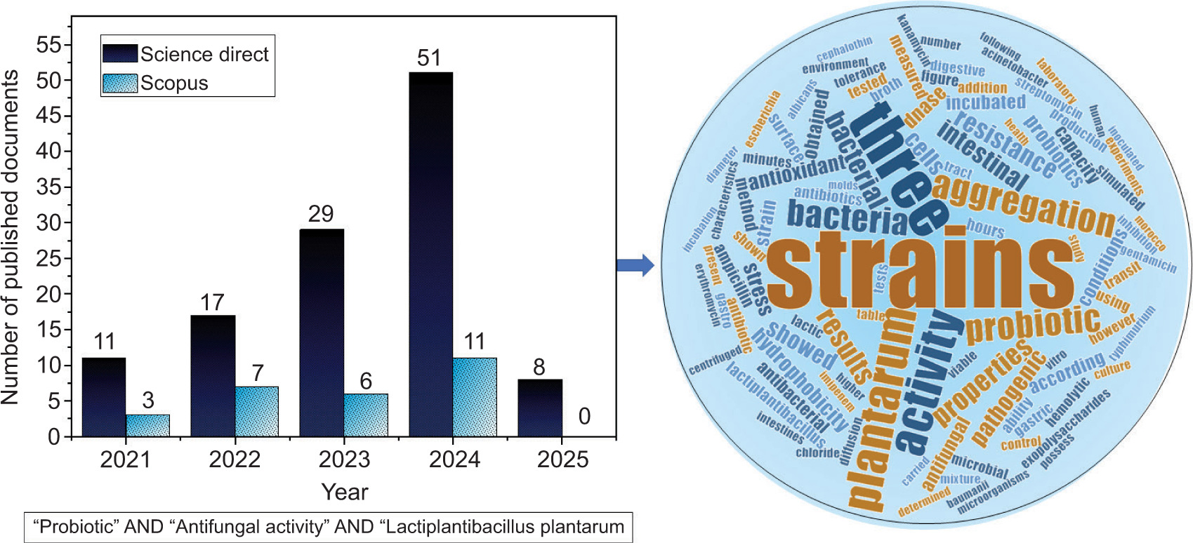 Some selection requirements need to be satisfied before using LAB strains as a probiotic. A bacterial strain that qualifies as probiotic must first tolerate the gastrointestinal tract conditions and colonize the intestines. It must then be resistant to the enzymes in saliva, able to endure the acidic environment of the stomach, and resist the bile and pancreatic fluid in the intestine. In addition, the probiotic LAB species should be able to bind to the cells of the intestine, permitting potential colonization of the intestines; therefore, characteristics of the cell surface, such as hydrophobicity, auto- and co-aggregation, are necessary for colonization. To avoid diseases induced by enteric pathogens, the probiotic strains need to have an anti-pathogenic effect (Amirsaidova et al. 2024). Furthermore, it is necessary to assess strain safety standards, such as the lack of resistance to antibiotics or recognized virulence properties, and it also needs to have other functional characteristics, like the production of beneficial compounds like exopolysaccharides and antioxidant activity. Figure 1 presents the bibliometric analysis of the scientific literature on the antifungal and probiotic activity of Lactobacillus plantarum (Lp. plantarum), and shows that there is a growing interest, reflected in the number of publications, which increased from 11 in 2021 to 51 in 2024 for Science Direct, and from 3 in 2021 to 11 in 2024 on Scopus.