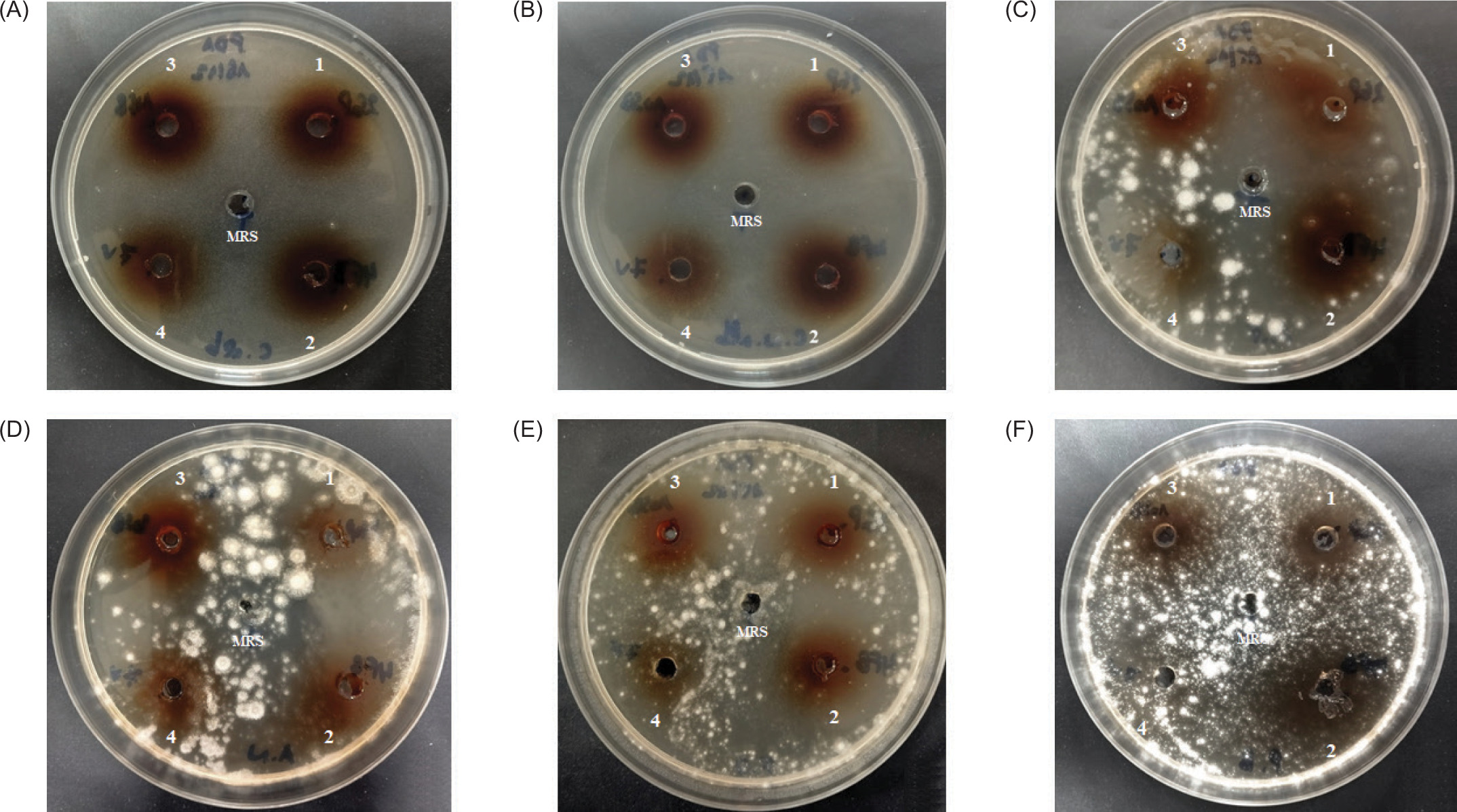 Antifungal activity of CFS from Lp. plantarum 2GP (1), 4FB (2), 10SB (3), and LAB 7V (4) against Candida albicans (a); Candida nonalbicans (b); Aspergillus fumigatus (c); Aspergillus niger (d); Fusarium oxysporum (e) and Penicilium brasilianum (f); MRS indicates the control without activity.