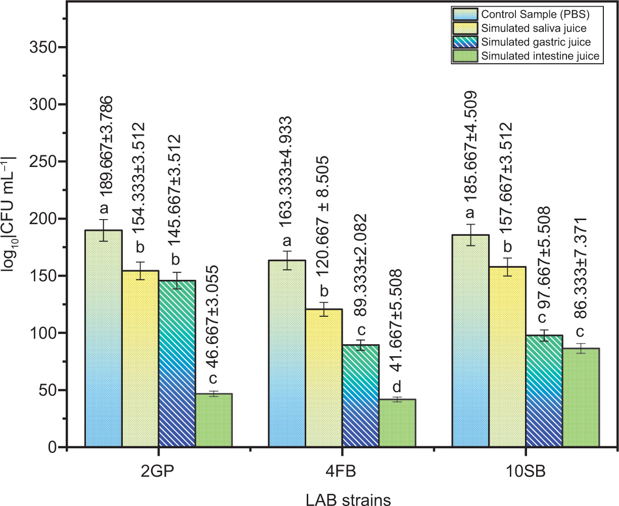 In vitro tests were conducted to determine the three LAB strains’ capacity to resist simulated conditions in the oro-gastrointestinal tract. The number of viable bacteria after exposure to the mentioned conditions is illustrated in Figure 3.