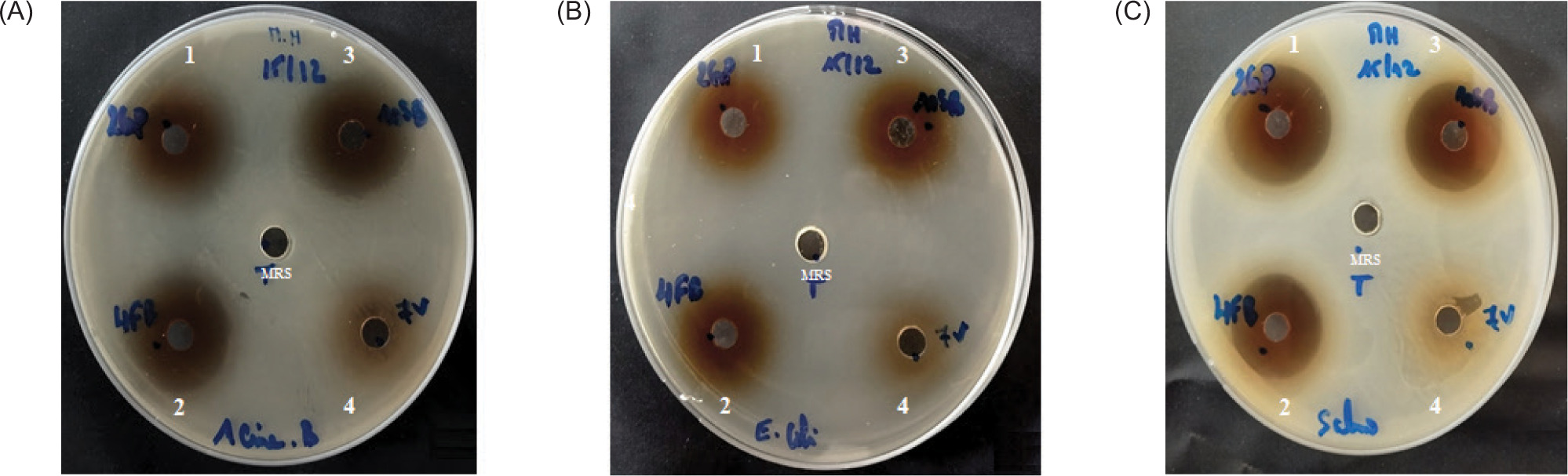 Antagonistic activity of LAB strains against Acinetobacter baumannii A144 (a), Escherichia coli 311 (b), and Salmonella typhimurium (c). Numbers for the LAB strain supernatants; 1: Lp. plantarum 2GP, 2: Lp. plantarum 4FB; 3: Lp. plantarum 10SB; and 4: nonactive LAB 7V. In the middle of the petri dish, the MRS broth was used as a control.