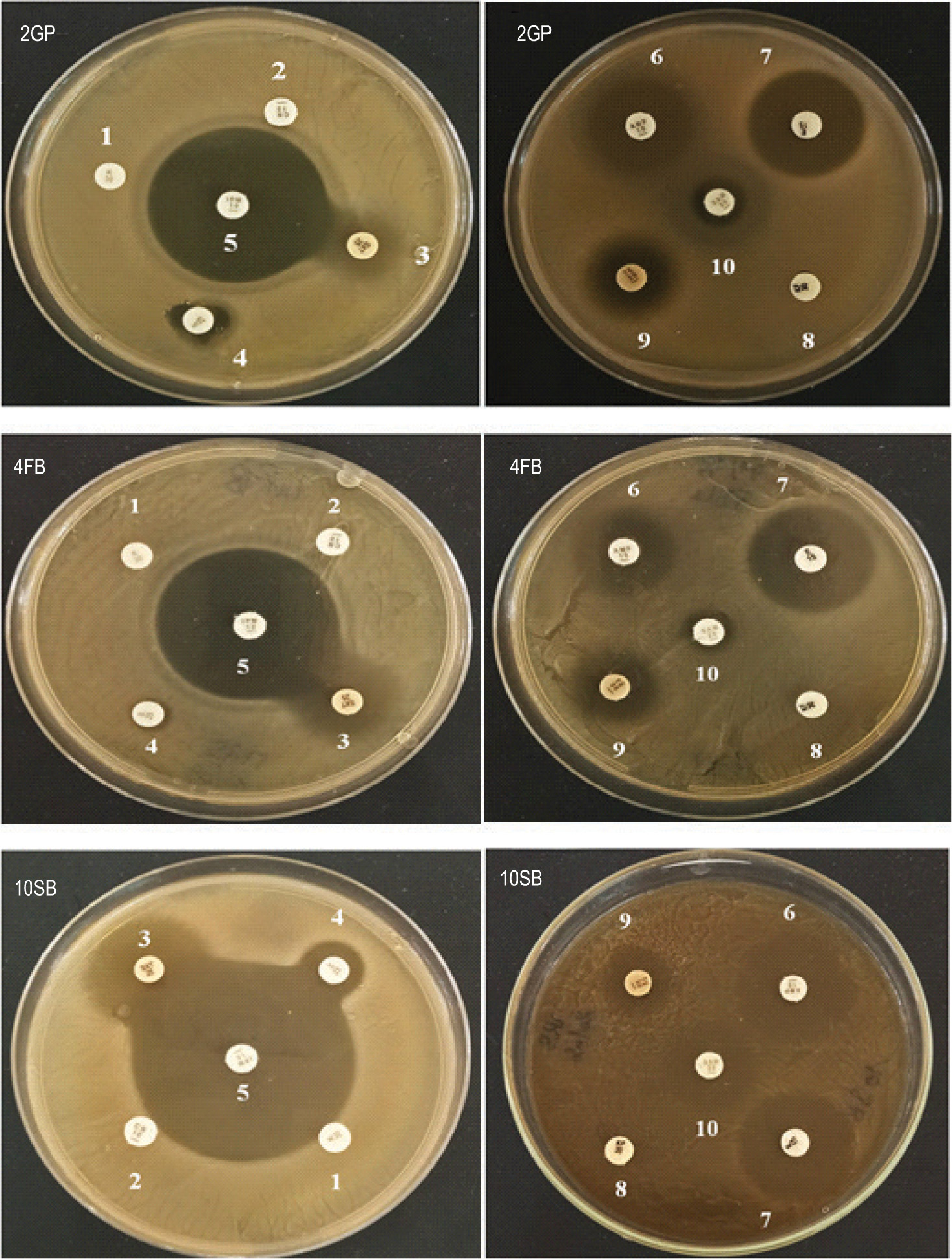 Antibiotic resistance profile of the three LAB strains, 2GP, 4FB, and 10SB. 1. Kanamycin (K30). 2. Gentamicin (CN10). 3. Thrimethoprim /sulfamethoxazole (SXT 25). 4. Streptomycin (S25). 5. Imipenem (IPM10). 6. Ampicillin (AMP10). 7. Erythromycin (E15). 8. Cephalothin (KF30). 9. Tetracycline (TE30). 10. Ampicillin/sulbactam (SAM20).