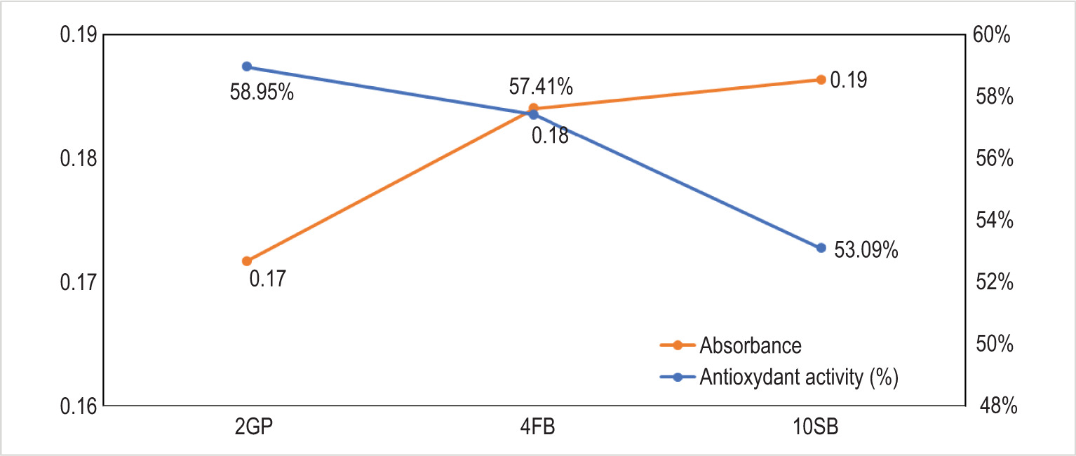 The results obtained show that the three LAB strains can scavenge free radicals by more than 50%. These results highlight a significant variation in antioxidant activity (%) among the three studied strains, namely, 2GP, 4FB, and 10SB. The 2GP strain exhibits the highest antioxidant activity at 59.95%, followed by 4FB (57.41%) and finally 10SB (53.09%).