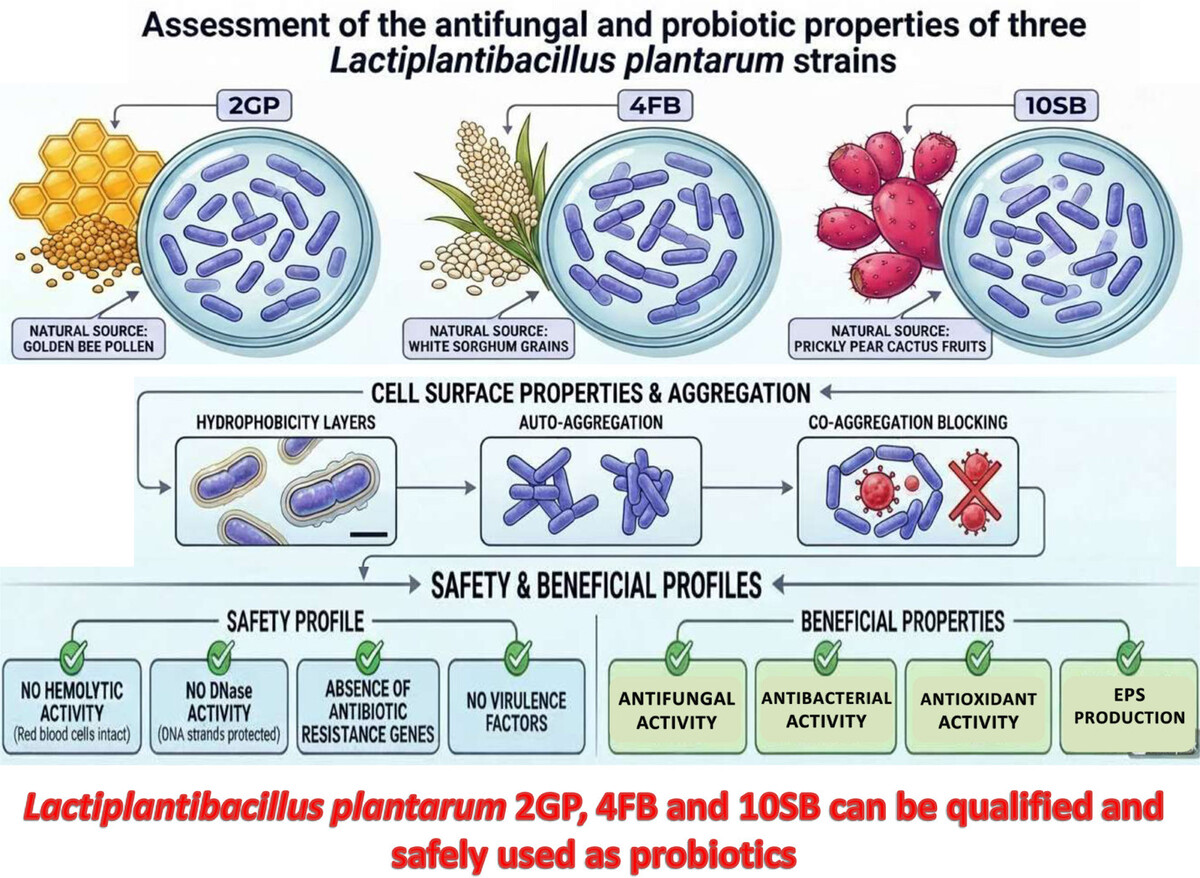 In the present study, we report three bacterial strains isolated from bee pollen, Opuntia ficus-indica fruits, and white sorghum, respectively. These strains are identified as Lactiplantibacillus plantarum (Lp. plantarum) and possess strong antifungal activity (Chbihi Kaddouri et al. 2025).