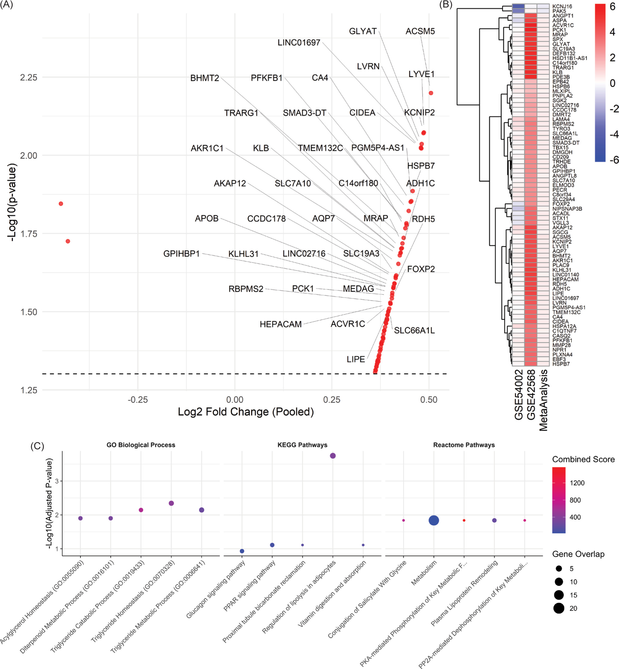 Transcriptomic meta-analysis, expression patterns, and enrichment analysis of breast cancer-associated genes. (A) Volcano plot of the meta-analysis results showing pooled log2 fold change. Each dot represents a gene, with several significant genes labeled. The dashed horizontal line indicates the significance threshold (p = 0.05). (B) Combined heatmap of the 77 overexpressed genes across the two datasets (GSE54002 and GSE42568) and the pooled meta-analysis. Rows represent genes; columns represent the datasets. Colors indicate log2 fold changes, with red denoting upregulation and blue denoting downregulation.(C) Top 5 enriched terms for GO Biological Processes, KEGG Pathways, and Reactome pathways. The enrichment results prominently feature pathways related to lipid-associated processes such as triglyceride, acylglycerol metabolism, PPAR signaling pathway, and plasma lipoprotein modeling process. For each panel, the X-axis shows pathway names, and the Y-axis indicates –log10(Adjusted P-value). Dot sizes represent the number of overlapping genes, and dot colors reflect the Combined Score calculated from enrichR, with higher scores in red.