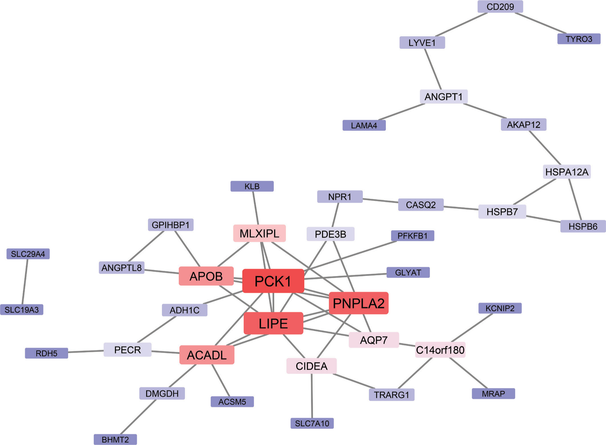 Protein–protein interaction (PPI) network of the 77 overexpressed genes. The network highlights central hub genes involved in lipid metabolic processes, including PCK1, LIPE, PNPLA2, ACADL, and APOB. These genes exhibit high connectivity within the network. Surrounding nodes represent interacting genes, Red shades indicating higher centrality, and blue shades indicating lower centrality. The network highlights the pivotal role of lipid metabolism pathways and their interconnectedness in breast cancer biology.