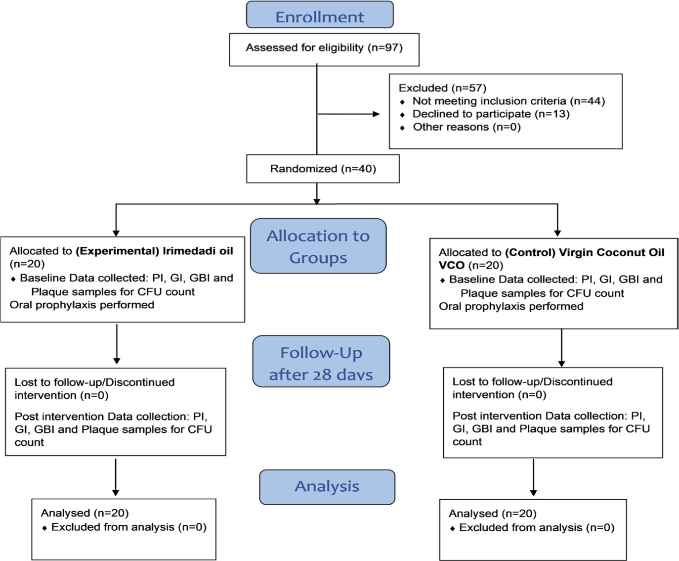 This research constitutes a randomized controlled trial focused on individuals aged 18-65 diagnosed with plaque-induced gingivitis, conducted at a dental facility in Pune. Ethical approval was secured from the Institutional Ethics Committee (DYPDCH/DPU/EC/583/185/2023), and the trial was registered with the Clinical Trials Registry, India. CTRI/2024/04/065946 The sample size was determined to be 40 individuals, calculated using a 95% confidence interval, 80% power, and a 5% alpha error. Participants were evaluated for oral hygiene and included if they possessed a minimum of 20 teeth, engaged in daily brushing, had not received periodontal therapy in the preceding 6 months, and demonstrated a GI score of ≥ 1 with bleeding upon probing and probing depth ≤ 3mm. The exclusion criteria were periodontal pockets measuring > 4mm, ongoing oil pulling activities, antibiotic treatment, pregnancy, allergies to herbal items, tobacco consumption, mouth breathing, or orthodontic interventions. Participants were allowed to withdraw from the study at any time. An individual examiner, trained and calibrated, performed the assessments, attaining a Cohen’s Kappa score of 0.83, signifying near-perfect concordance. For pilot testing, 10 eligible participants were chosen, and a case history sheet was created to document patient data, including age, sex, unique identification number, and various indices such as the Gingival Index by Loe and Silness (1963), Modified Plaque Index by Silness and Low (1964), Gingival Bleeding Index by Carter and Barnes (1974), and colony-forming units (CFU) count (Loe and Silness, 1963; Löe, 1967; Carter and Barnes, 1974).