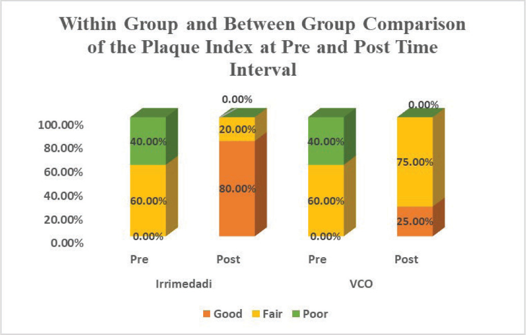 Normality of the data was assessed by Kolmogorov-Smirnov and Shapiro-Wilk tests, verifying uniform distribution. The mean ages of participants were comparable in both groups: 43.80 ± 13.03 for the experimental group (Irimedadi) and 44.10 ± 13.30 for the control group (VCO). The gender distribution showed 40% males and 60% females in the Irimedadi group, but the VCO group had 65% males and 35% females, with no statistically significant difference. A comparative analysis of Plaque Index (PI) scores indicated significant improvements in the Irimedadi group, with 80% attaining favourable scores posttreatment, in contrast to merely 25% in the VCO group. Seventy-five percent of VCO participants achieved fair marks. The enhancement in favourable PI scores from pretreatment to posttreatment was statistically significant for both groups. At the pretreatment stage, no significant difference was observed between groups; however, a significant difference was noted posttreatment (P < 0.05) (Table 1; Figure 2).