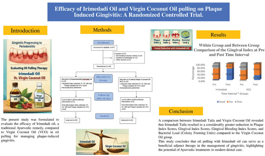 The research revealed significant reductions in PI, GI, GBI scores, and bacterial load after treatments with Irimedadi taila and VCO. Irimedadi taila proved to be palatably acceptable and demonstrated a more pronounced reduction in these scores compared to VCO and can be deemed highly successful in alleviating plaque-induced gingival inflammation, indicating its potential as an outstanding oral health intervention.
