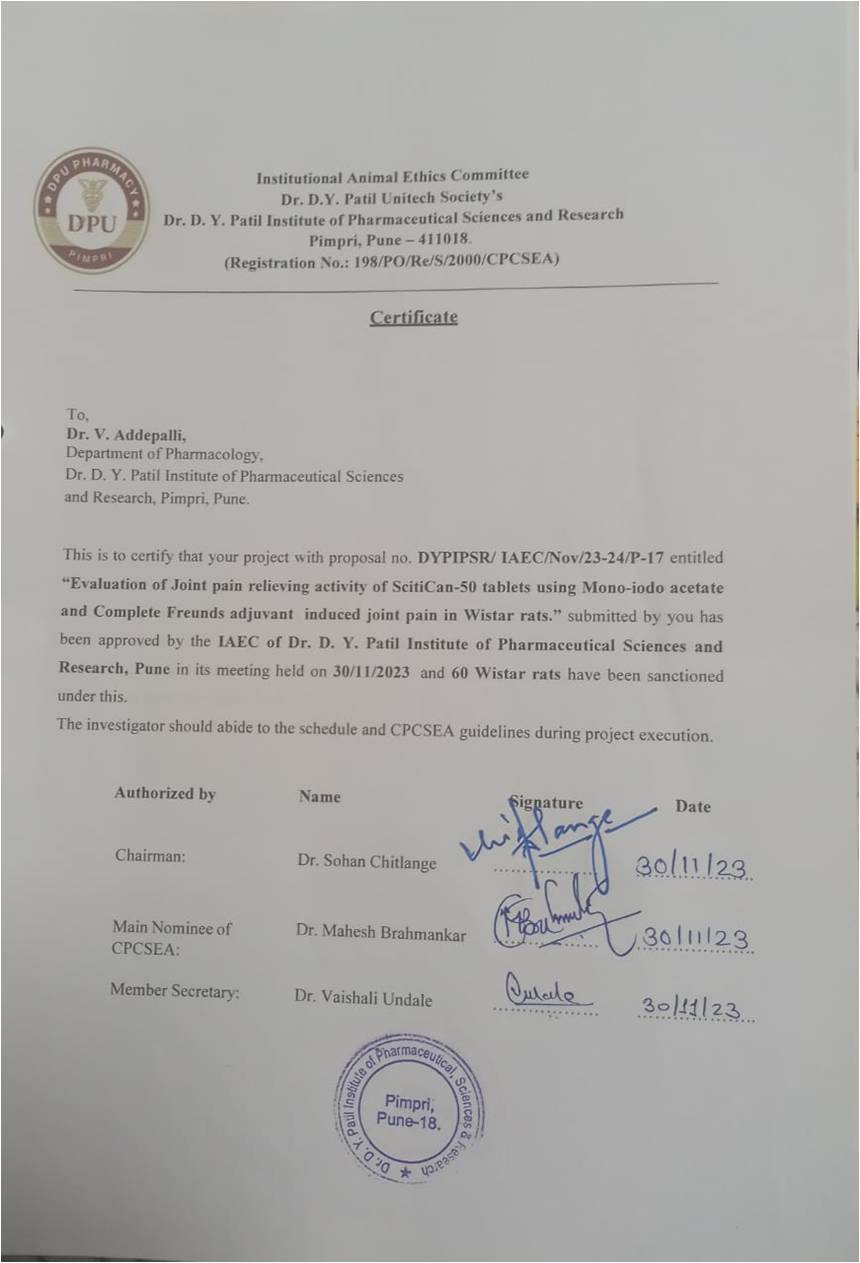 This study aims to explore the effectiveness and safety of Scitican-50, a polyherbal tablet, by investigating its impact on pain relief, side effect profile, and mechanisms of action. If proven effective, this approach could offer a safer, more holistic treatment option for individuals suffering from joint pain, reducing the burden of adverse effects associated with conventional treatments.