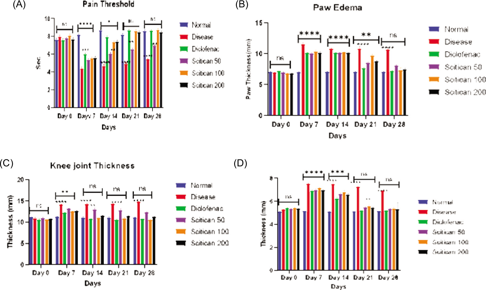 Induction of arthritis significantly increased the thickness of knee joint to 14 mm by Day 7 (p < 0.0001). Diclofenac reduced swelling to near-normal levels (10.2 mm) by Day 21. Scitican-50 moderately decreased thickness to 11.5 mm (p < 0.01) by Day 21 and maintained ~12 mm by Day 28 (p < 0.05). Scitican-100 and -200 effectively attenuated inflammation, reducing thickness to ~11.2 mm by Day 28, demonstrating dose-dependent anti-inflammatory effects (Figure 1C).