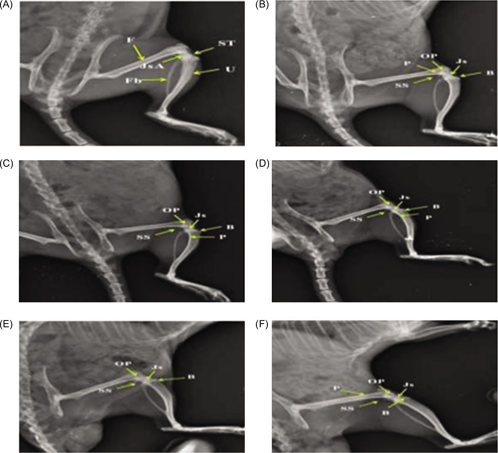 Radiographs showed intact joints in the normal group, while the disease control group exhibited severe pathology with marked swelling of soft tissues and periosteal reaction (score 3), plus narrowing of joint space and erosion of bone (score 2). Diclofenac significantly improved joint condition with mild swelling and reduced bone damage (score 1). Scitican-50 demonstrated dose-dependent radiological improvements: 50 mg/kg showed moderate pathology, 100 mg/kg reduced periosteal reaction and erosion, and 200 mg/kg provided substantial protection comparable to diclofenac. These findings highlight Scitican’s disease-modifying potential in inflammatory arthritis (Table 3, Figure 2).