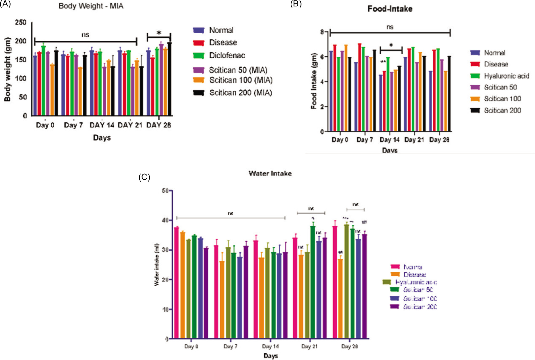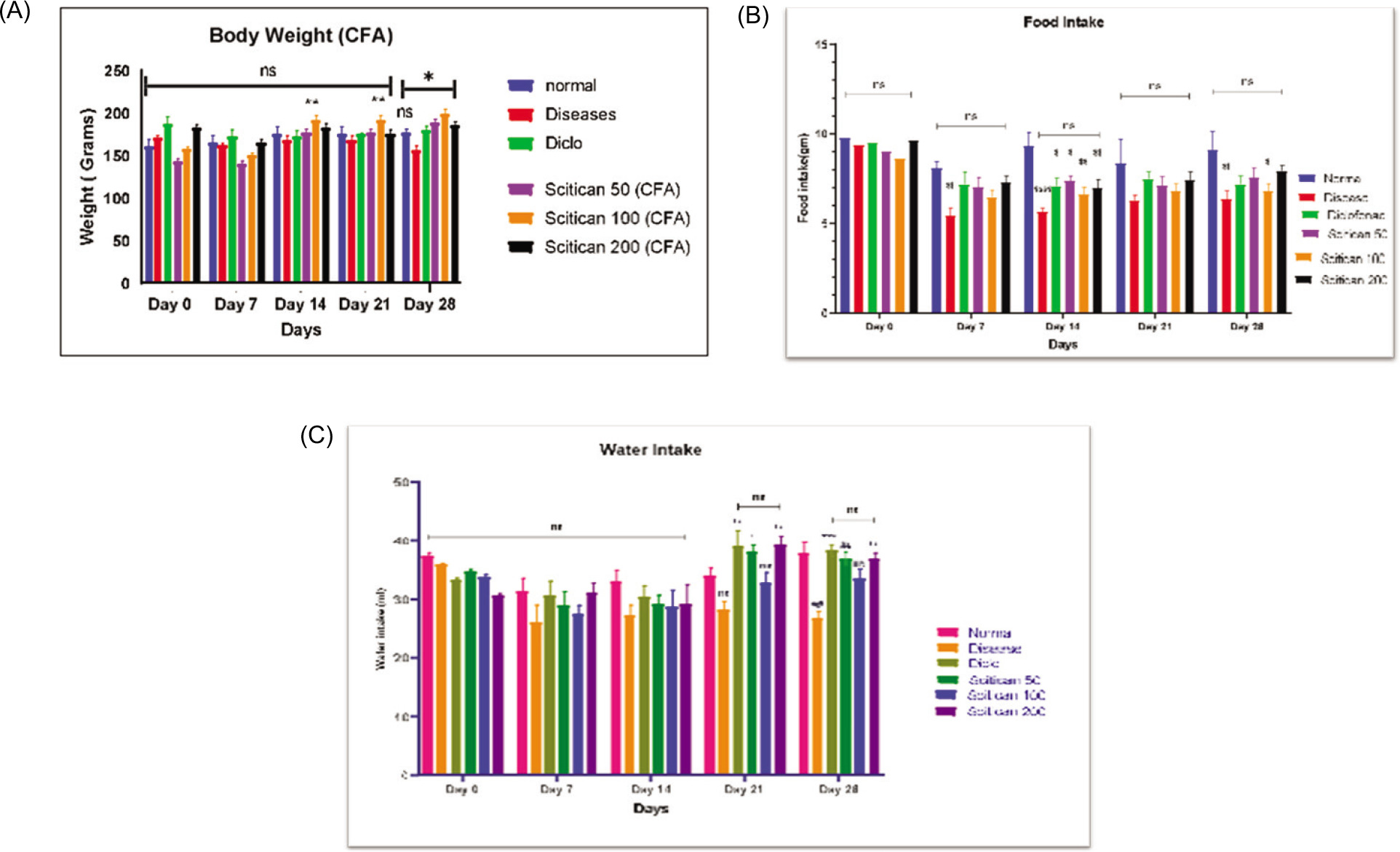 In the CFA model, disease controls showed decreased body weight (170 to 158 g by Day 28) and reduced food and water intake (p < 0.001 for food on Day 14). Scitican-100 significantly improved body weight by Days 14 and 21 (187 g; p < 0.01) and increased food intake (p < 0.05 on Day 14). Water intake also improved significantly in diclofenac, Scitican-50, and Scitican-100 groups by Day 28 (p < 0.05), indicating alleviation of joint pain and enhanced health (Figure 7).