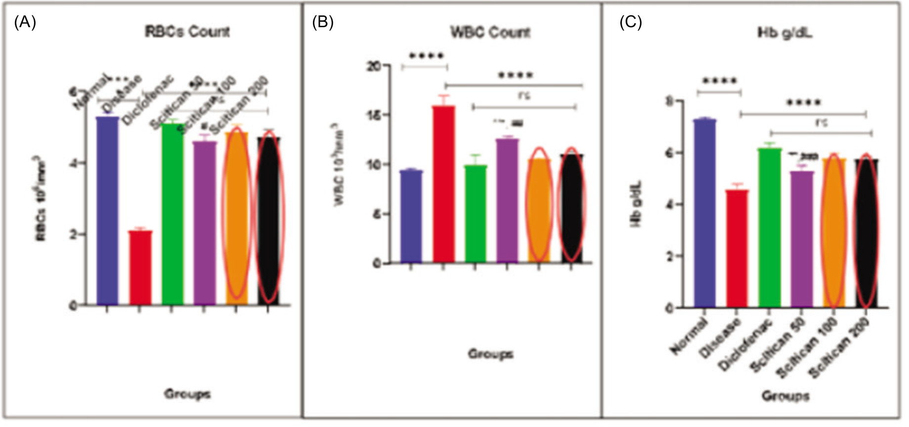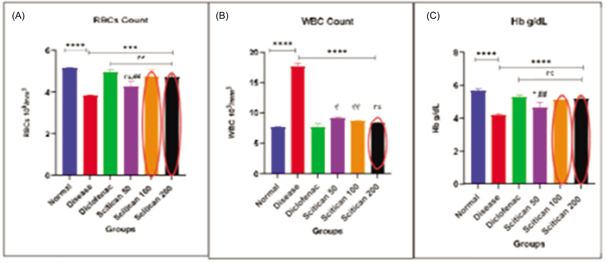 In the CFA model, disease rats showed significant anemia with reduced RBCs (3.8 vs. 5.2 million/μL, p < 0.001) and elevated WBCs (17.5 vs. 7.4 cells/μL, p < 0.0001), indicating chronic inflammation. Scitican-100 mg and –200 mg doses effectively restored RBCs (4.8 million/μL) and lowered WBCs (~8.7–8.8 cells/μL), comparable to diclofenac (RBC: 5.0; WBC: 7.5). Hb was paradoxically higher in disease controls (5.6 vs. 4.2 g/dL, p < 0.0001), with Scitican-50 and diclofenac showing modest normalization. These results affirm Scitican’s anti-inflammatory and hematoprotective effects (Figure 8).
