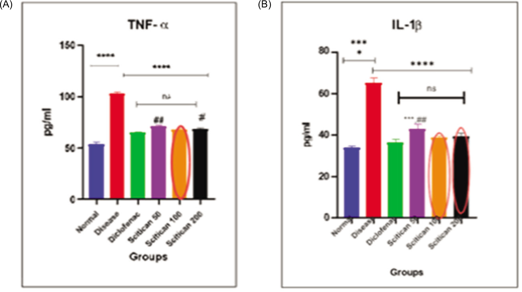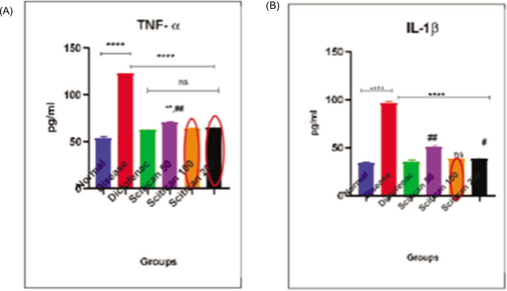 In the CFA model, TNF-á and IL-1â levels were significantly elevated in disease controls (TNF-á: 90 pg/mL, IL-1â: 65 pg/mL, p < 0.0001) versus normal. Scitican-50 treatment dose-dependently reduced TNF-á to 50–40 pg/mL (p < 0.01) and IL-1â to 42–36 pg/mL (p < 0.05), approaching diclofenac’s potent suppression (TNF-á: 30 pg/mL, IL-1â: 34 pg/mL). These results confirm Scitican’s anti-inflammatory efficacy in chronic arthritis (Figure 9).