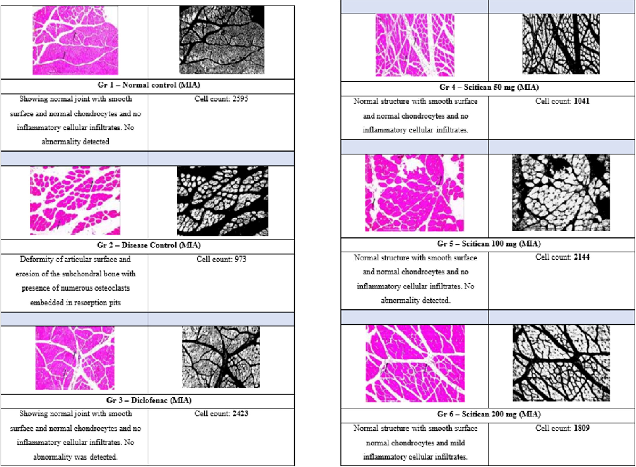 Histopathology of MIA-induced OA showed intact joint architecture and high chondrocyte counts in normal controls (2595 cells). Disease controls exhibited severe degeneration and reduced cell viability (973 cells). Diclofenac preserved joint integrity (2423 cells). Scitican-50 demonstrated dose-dependent chondroprotection, with 100 mg/kg maintaining near-normal structure and cell count (2144), comparable to diclofenac. The 200 mg/kg dose showed moderate protection (1809 cells), while 50 mg/kg offered partial recovery (1041 cells). These results underscore Scitican’s effective cartilage protection, optimally at 100 mg/kg (Figure 6).