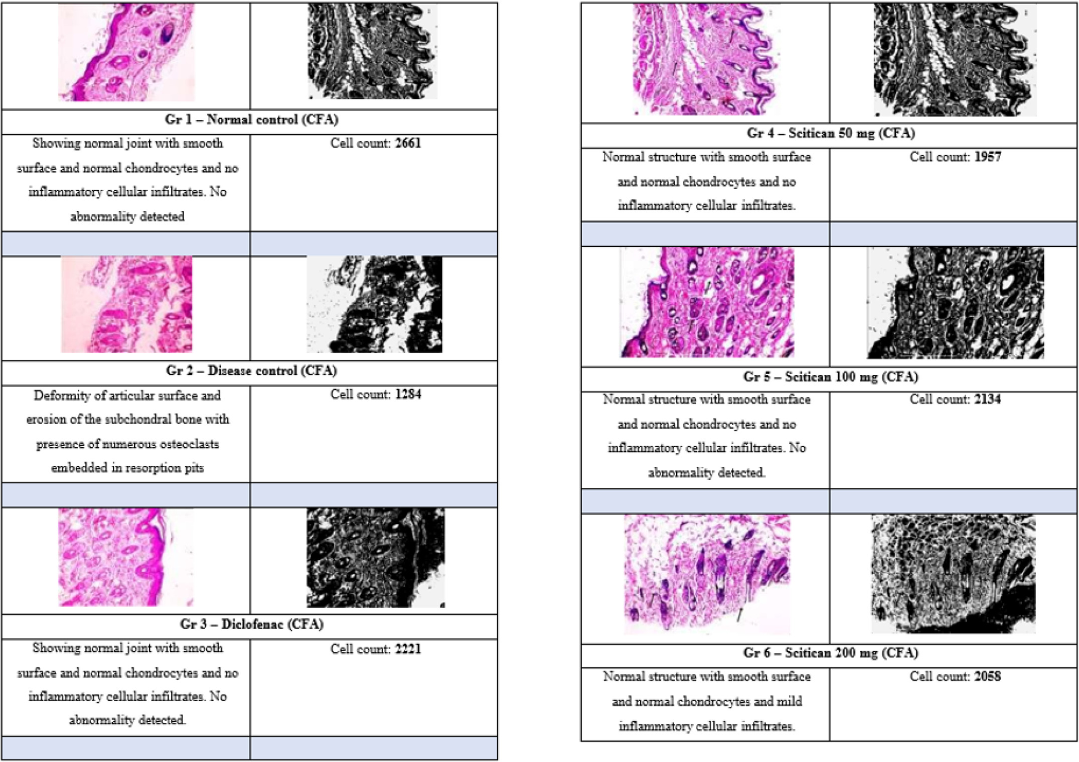 Histology revealed intact joint structure and high chondrocyte counts in normal controls (2661 cells). CFA-induced arthritis caused severe joint damage and reduced cell viability (1284 cells). Diclofenac restored normal morphology with increased cell count (2221). Scitican-50 showed dose-dependent chondroprotection: 100 mg/kg preserved joint architecture and inflammation absence (2134 cells), closely matching diclofenac. The 200 mg/kg dose of Scitican-50 maintained integrity with mild inflammation (2058 cells), while 50 mg/kg offered moderate protection (1957 cells). These findings support Scitican’s anti-inflammatory and chondroprotective potential (Figure 10).