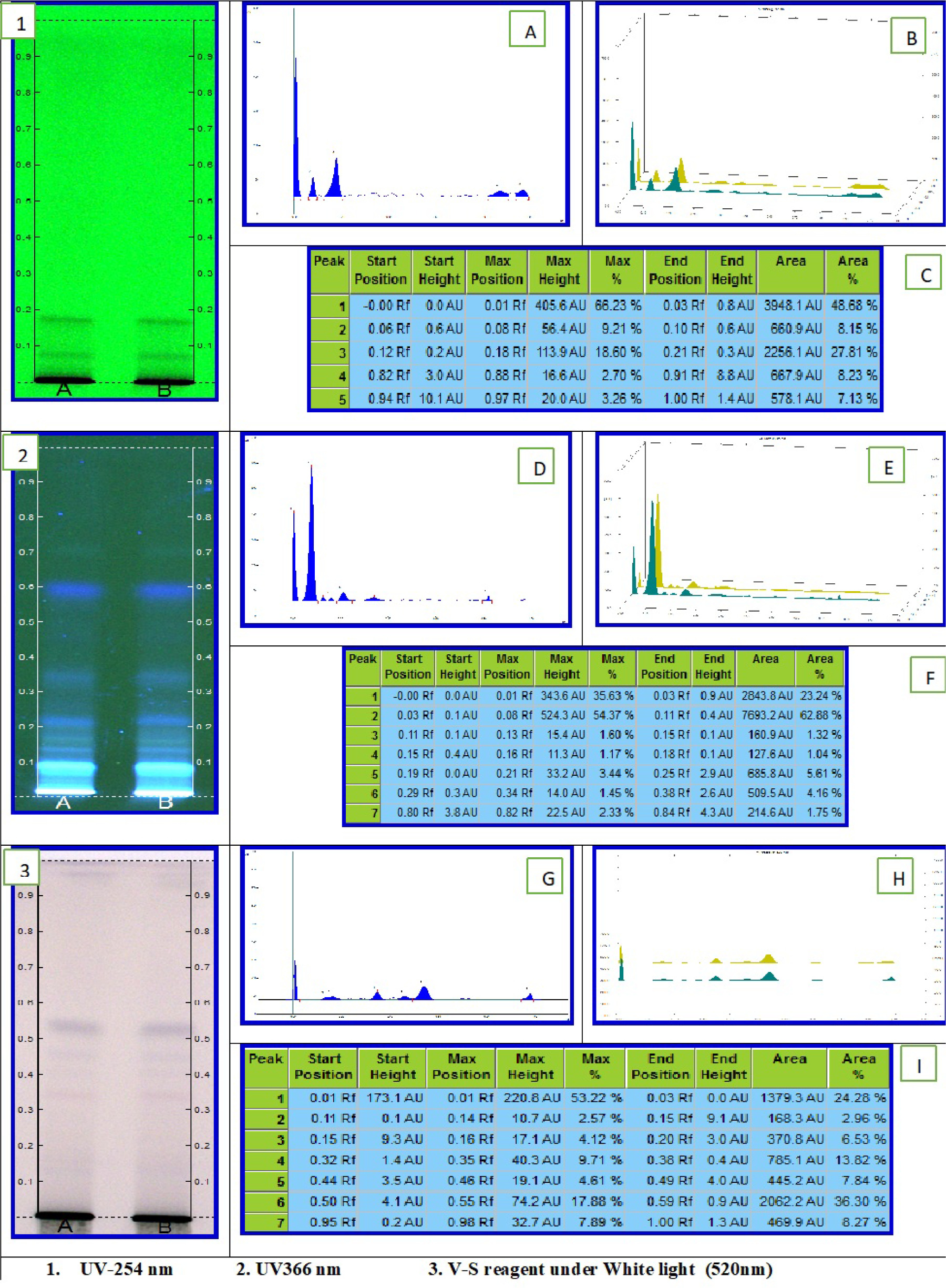 Rf values of HPTLC of alcoholic extract of polyherbal Unani formulation. (A) HPTLC finger print of PUF in alcohol extract at 254 nm, (B) 3D densitometry chromatogram of PUF at 254 nm, (C) peak table of PUF at 254 nm, (D) HPTLC finger print of PUF in alcohol extract at 366 nm, (E) 3D densitometry chromatogram of PUF at 366 nm, (F) peak table of PUF at 366 nm, (G) V-S reagent finger print of PUF in alcohol extract at 520 nm, (H) 3D densitometry chromatogram of PUF at 520 nm, and (I) peak table of PUF at 520 nm.