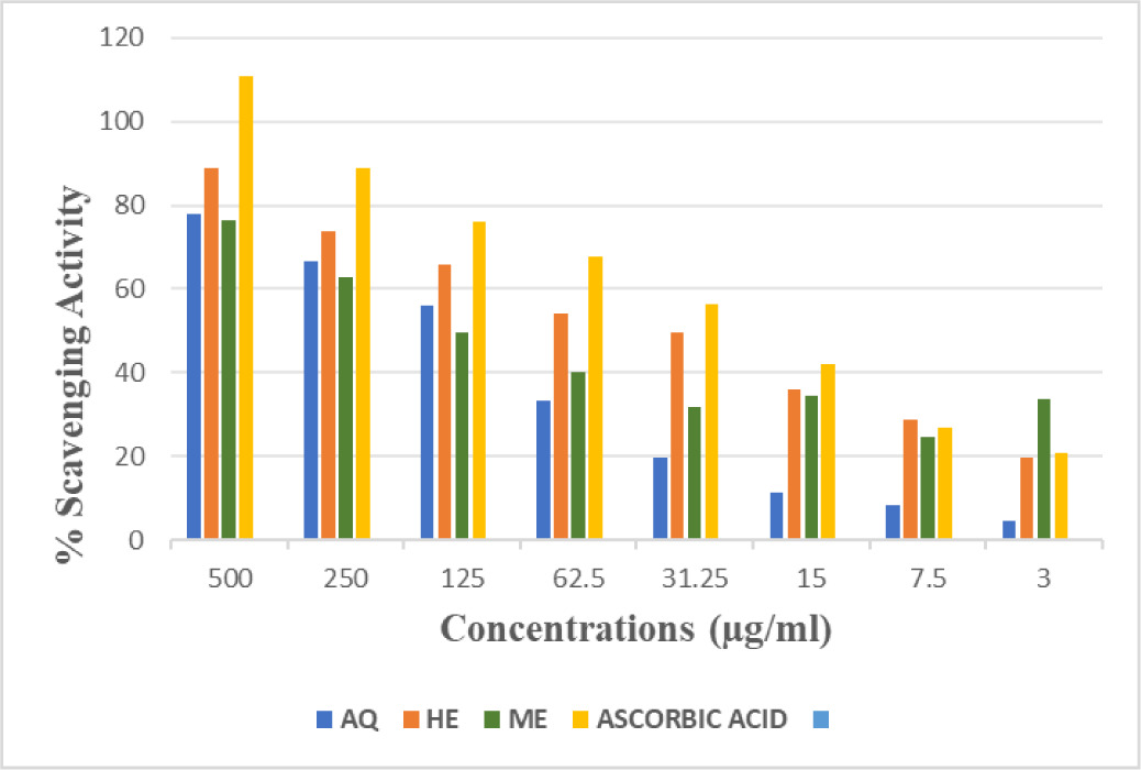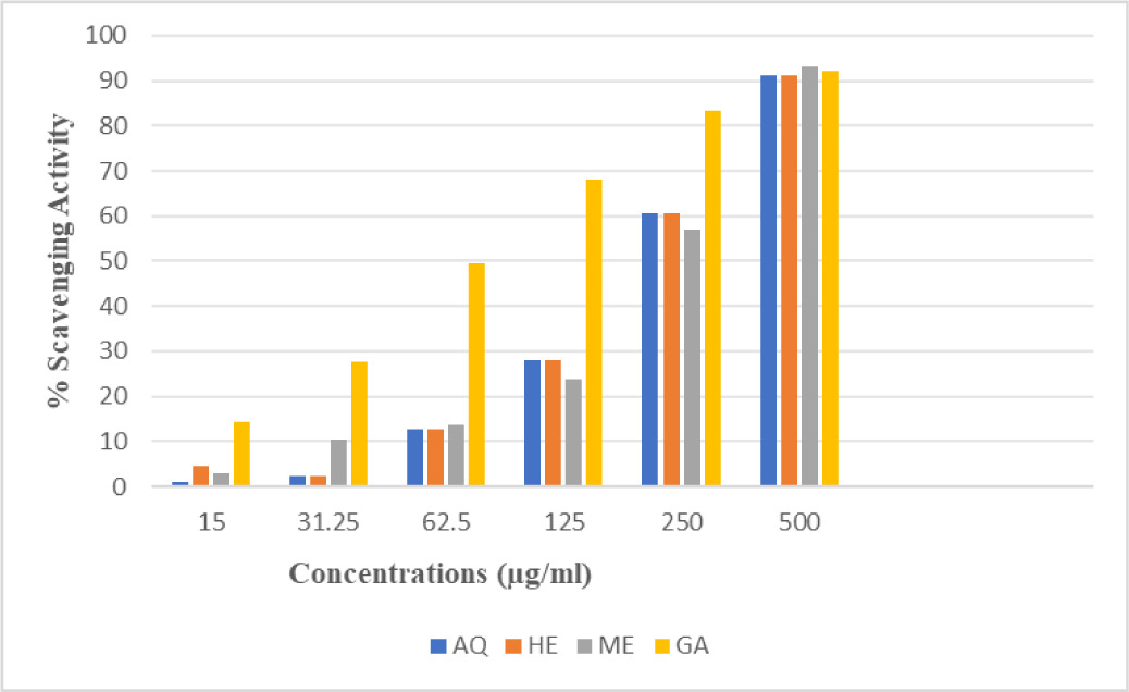 All extracts of PUF showed dose-dependent antioxidant activity, increasing with higher concentration. Result showed almost similar activity in all extracts of the PUF (Table 5 and Figure 3).