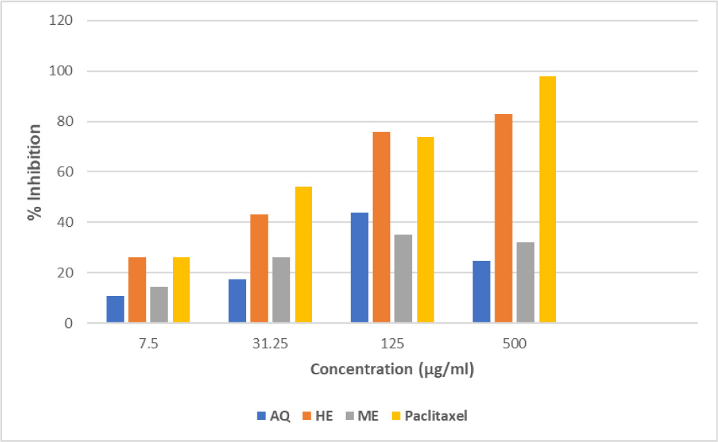 The percentage of inhibition of the extract against the cell line was calculated using the formula provided below: