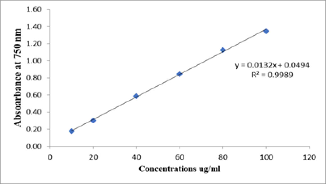 The TPC was measured using gallic acid (Figure 5) and expressed in milligrams of GAE. The extracts demonstrated a notable concentration of phenolic compounds, varying from 64.32±1.33 to 130.5±8.7 mg of GAE/g of extract. The methanolic extract exhibited the highest total phenolic concentration (Table 7).