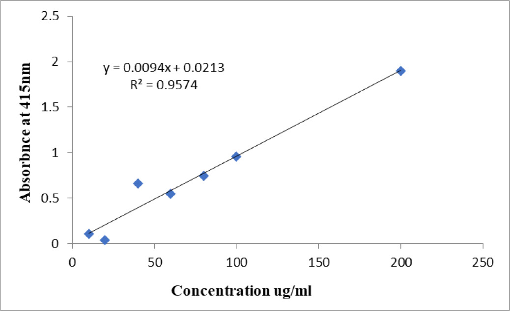 Total TFC was estimated by Quercetin (Figure 6) and expressed as milligrams of QE. All the extracts contained a considerable amount of TFCs from 12±0.9 to 64±7.7 mg of QE/g of extract. Methanolic extract exhibited the highest total TFC (Table 7).