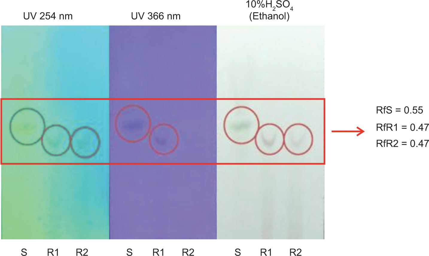 TLC was used to analyze the presence of β-carotene in RFO fractions before and after heating. Various solvent systems of n-hexane and ethyl acetate were tested, and the optimal separation was achieved using a specific ratio determined by trial and error. The RFO samples showed spots with Rf values of 0.55 before heating and 0.47 after heating, as shown in Figure 1, which were comparable to the β-carotene standard. Observations under visible light, UV 254 nm, and UV 366 nm confirmed the presence of compounds with similar migration and fluorescence characteristics, suggesting the retention of β-carotene or its derivatives in the samples.