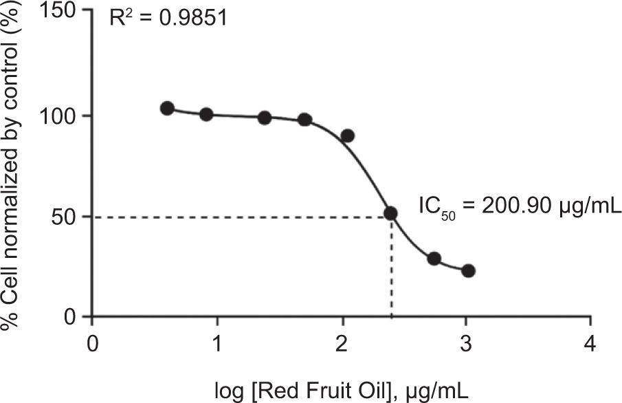 The cytotoxic activity of RFO was evaluated using B16-F10 melanoma cells through the Resazurin assay. As shown in Figure 2, the IC50 value obtained was 200.90 µg/mL, indicating a moderate level of cytotoxic activity. In addition, results from the Resazurin assay showed that higher doses of RFO induced morphological changes in the cells, such as increased cell size, which may be associated with cytotoxic effects. Signs of cytotoxicity, including cell shrinkage, detachment, and rounding, were observed, suggesting membrane and structural damage to melanoma cells. However, RFO did not exhibit toxic effects on B16-F10 cells at concentrations of 125, 62.5, 31.25, 15.63, and 7.81 µg/mL, indicating that it is safe at lower concentrations.