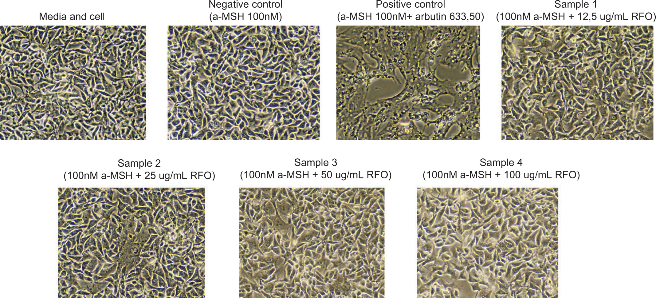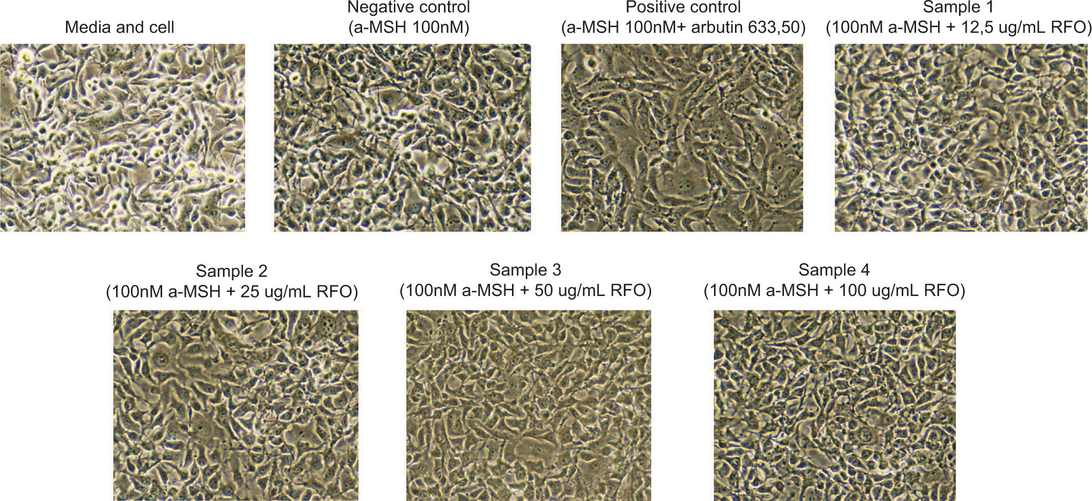 This laboratory-based experimental study was conducted at the Central Laboratory of Universitas Padjadjaran. The research utilized B16F10 melanoma cell cultures stimulated with α-MSH. Samples were obtained from confluent and uncontaminated cultured cells. The study included seven groups: one media control (medium + cell) group, one negative control group, and one positive control group, and four treatment groups. The treatment groups consisted of B16F10 cells that were stimulated with α-MSH and given RFO at concentrations of 12.5, 25, 50, and 100 μg/mL, respectively. The media control group contained untreated B16F10 cells, and the negative control group included cells that were only stimulated with α-MSH. Cells that were treated with Arbutin and α-MSH made up the positive control group.