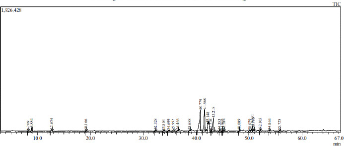 Figure 1 presents the mass spectrum of the ginger EO oil under analysis, illustrating the mass spectrum patterns of volatile compounds derived from ginger cultivated in Bukit Karan Village.