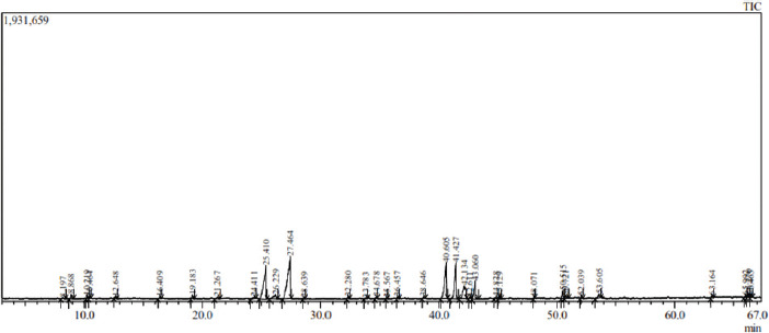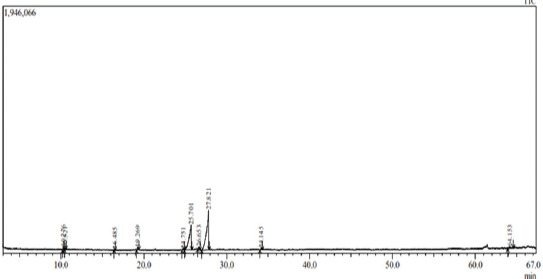 All quantitative analyses performed on the EO samples yielded positive results regarding the presence of phytochemical compounds. Utilizing GC-MS, a total of 25 major compounds were successfully identified in the ginger EO. In addition, five other compounds were detected based on chromatogram signals, although they have not yet been definitively identified. The chemical composition of ginger EO is detailed in Table 1, which enumerates the active compounds from ginger cultivated in Bukit Karan Village.