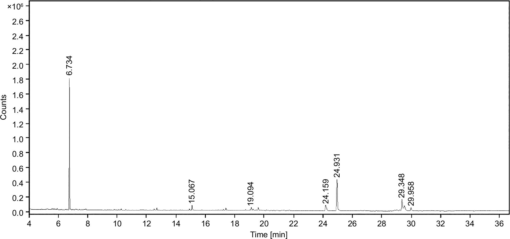 GC-MS was used to identify the compounds by separating them in gas chromatography based on their chemical properties and then analysing the resulting mass spectra to determine their molecular structure and identity. We determined the relative abundance of each component by calculating the percentage based on comparing the average peak area of each component to the total peak area obtained from the chromatogram. This method enabled us to quantify the contribution of each compound within the mixture, providing insights into its composition and distribution.