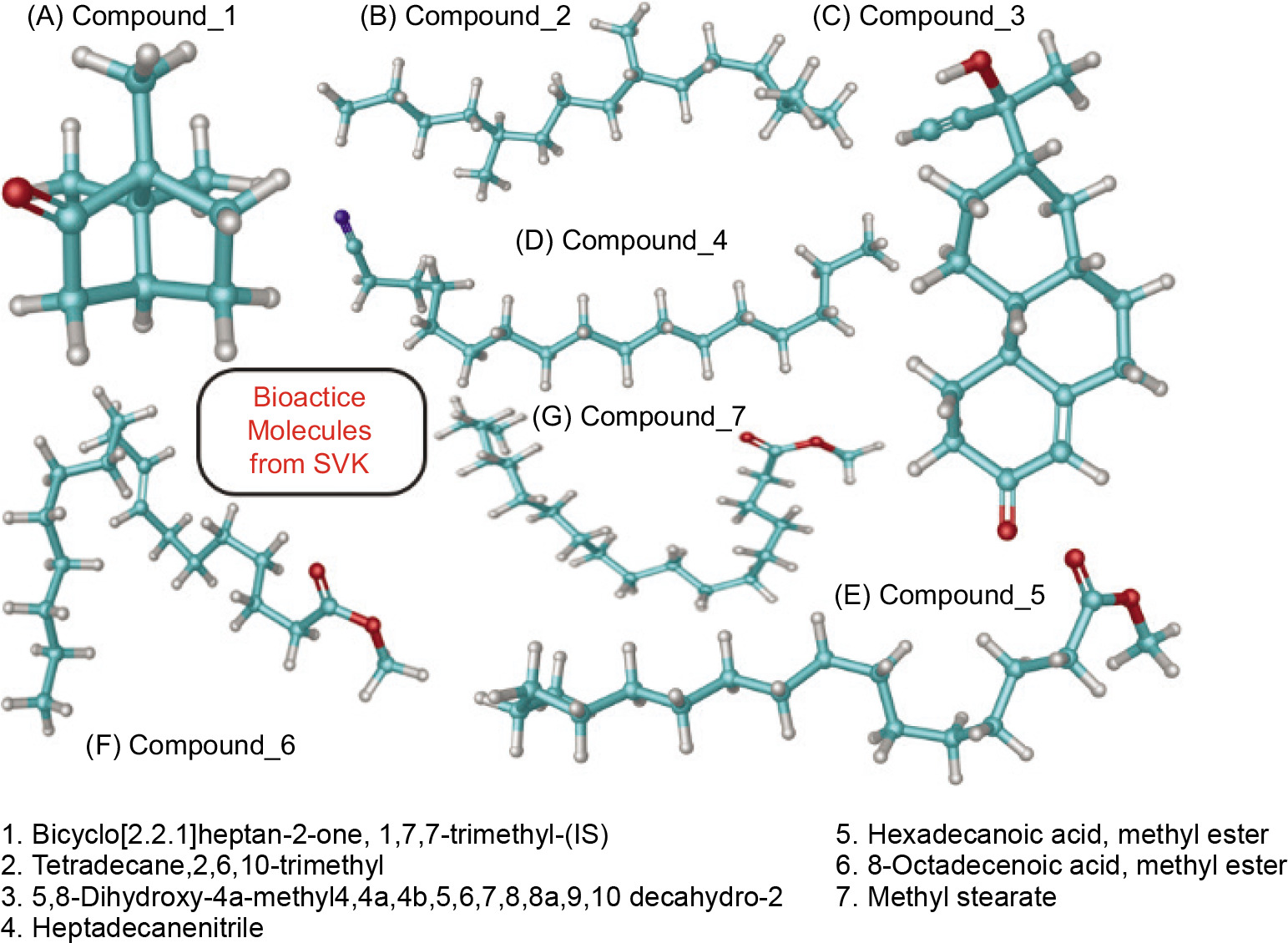 All seven secondary metabolites exhibited distinct RTs and varied area percentages. From this study, metabolites with area percentage exceeding 5% were deemed significant. The major component present in the SVK was Bicyclo [2.2.1] heptan-2-one, 1,7,7-trimethyl-(IS) (compound 1), which had the highest area percentage of 57.27%. This was followed by hexadecanoic acid, methyl ester (compound 5) (21.98%), 8-octadecenoic acid, methyl ester (compound 6) (8.07%), and heptadecane nitrile (compound 4) (6.22%). The remaining three metabolites—Tetradecane, 2,6,10-trimethyl (compound 2); Methyl stearate (compound 7); and 5,8-Dihydroxy-4a-methyl-4,4a,4b,5,6,7,8,8a,9,10 decahydro-2 (compound 3)—had area percentage of 2.49%, 2.25%, and 1.72%, respectively, and hence were considered non-significant due to the presence of a negligible amount.