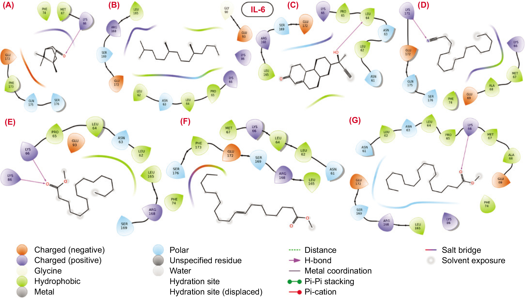 IL6: The docked complexes of bioactive molecules with IL-6 protein revealed that hydrogen bonds and hydrophobic interactions are the dominant forces contributing to the stability of the complexes. Specifically, compounds 1, 5, and 7 established hydrogen bonds with the positively charged residue Lys66. Additionally, compound 5 also formed a hydrogen bond with Lys86. Compounds 3 and 4 formed hydrogen bonds with the hydrophobic residue Leu64 and the positively charged residue Lys171. Compound 3 showed a docking score of approximately -3.229, as presented in Table 3. However, compounds 2 and 6 did not participate in hydrogen bond interactions with the binding pocket residues of IL-6. Instead, these compounds primarily engaged in hydrophobic contacts.