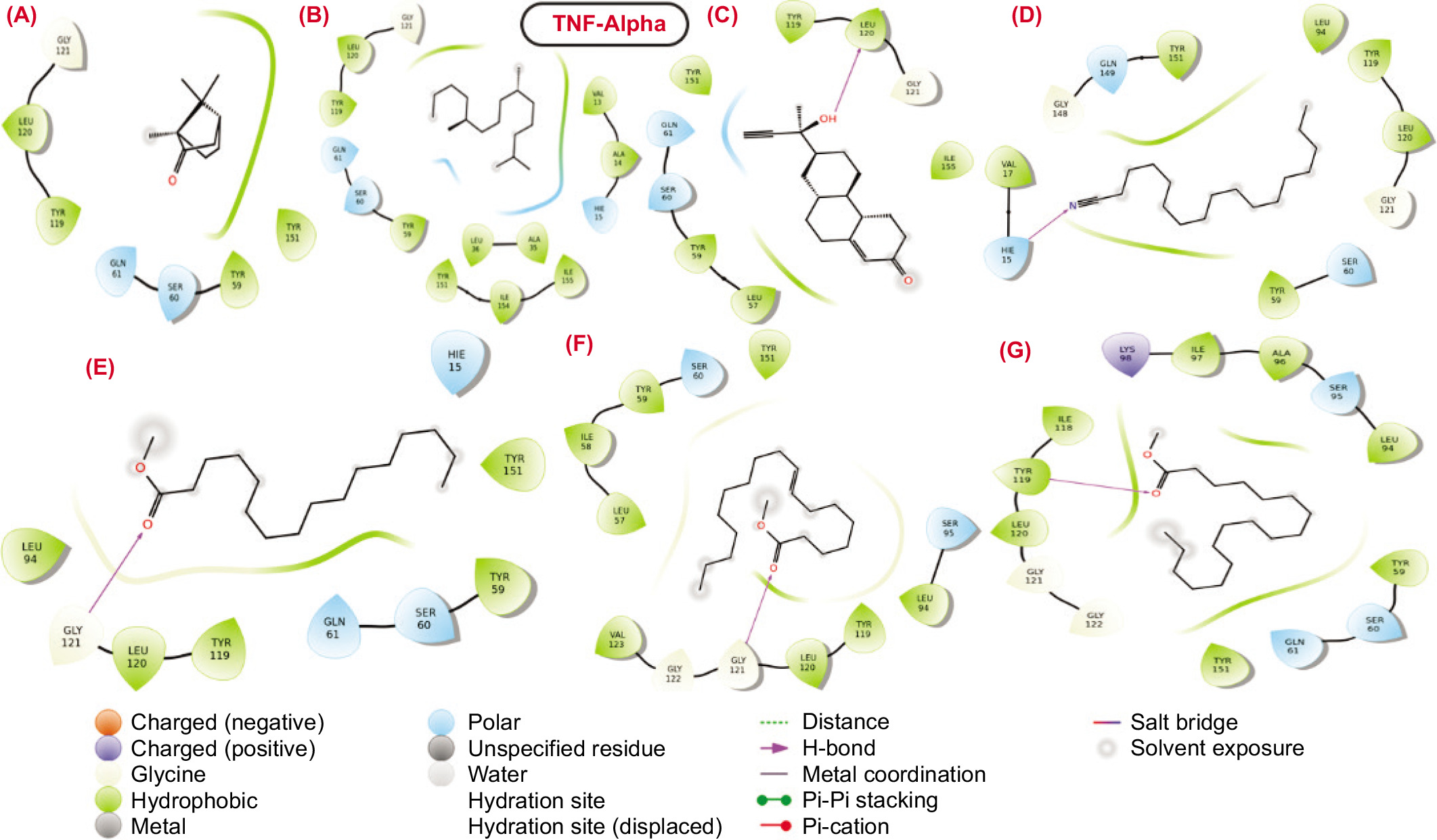 2D structural representation of molecular interaction between the bioactive molecules from SVK against TNF-Alpha protein.