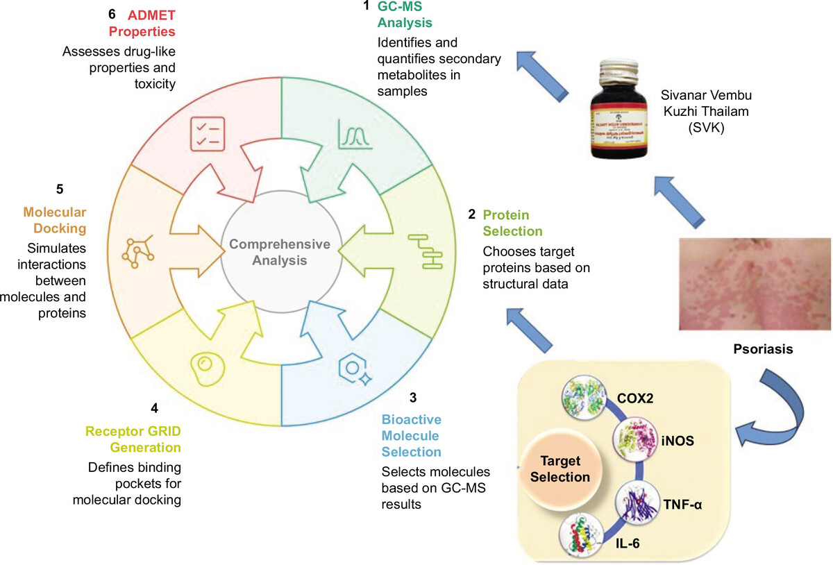 The Siddha system is one of the ancient traditional Indian medicinal practices and is distinctively rooted in the Southern region of India. Sivanarvembu Kuzhi Thailam (SVK) is one of the classical Siddha formulations used for various skin diseases. The ingredients are Sivanaarvembu (SV) (Indigofera asplathoides), Akasa Karudan Kizhangu (Corallocarpus epigaeus), Valuluvai arisi (Celastrus paniculatus), and Karpooram (Cinnamomum amphora) (Siddha Formulary of India, 1992). A special technique called the Kuzhi thailam method (a traditional technique of destructive distillation) is used to extract the oil. The phytochemical analysis of SVK reveals the presence of steroids, triterpenes, alkaloids, phenolic groups, tannin, glucose, catechins, proteins, and glucose (Ahmed et al. 2019). Ahmed Sundar (2017) conducted preliminary research on Sivanarvembu chooranam and concluded it to be an anti-inflammatory, analgesic, and anti-histaminic drug for psoriatic patients (Ahmed, 2017). Although Siddha medications are widely used for psoriasis, there are no published studies on their safety and therapeutic effectiveness (Amuthan, 2020). This study bridges traditional Siddha knowledge with modern scientific techniques by integrating phytochemical analysis, GC-MS profiling, and in silico molecular docking to elucidate the therapeutic potential and anti-inflammatory mechanism of SVK in psoriasis management.