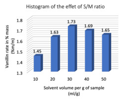 The solvent/substance ratio (S/M ratio) can influence the extraction efficiency, since a higher S/M ratio can lead to a higher concentration difference, solvent saturation, within certain limits, which has some advantages for mass transfer and solute solubility. The influence of S/M ratio on extraction efficiency had been studied between 10 and 50 mL/g, while controlling for other factors such as: 70% ethanol concentration, 45 minutes extraction time, 30 °C extraction temperature and 400 W microwave power. Fig. 6 shows that the percentage of vanillin increased significantly when the S/M ratio increased from 10 to 30 mL/g but slowly decreased when the S/M ratio increased from 30 to 50 mL/g. This indicates that the material transfer process reached its maximum level then the S/M ratio reached 30 mL/g. Therefore, a S/M ratio of 30 mL/g was chosen in subsequent (Figure 6).