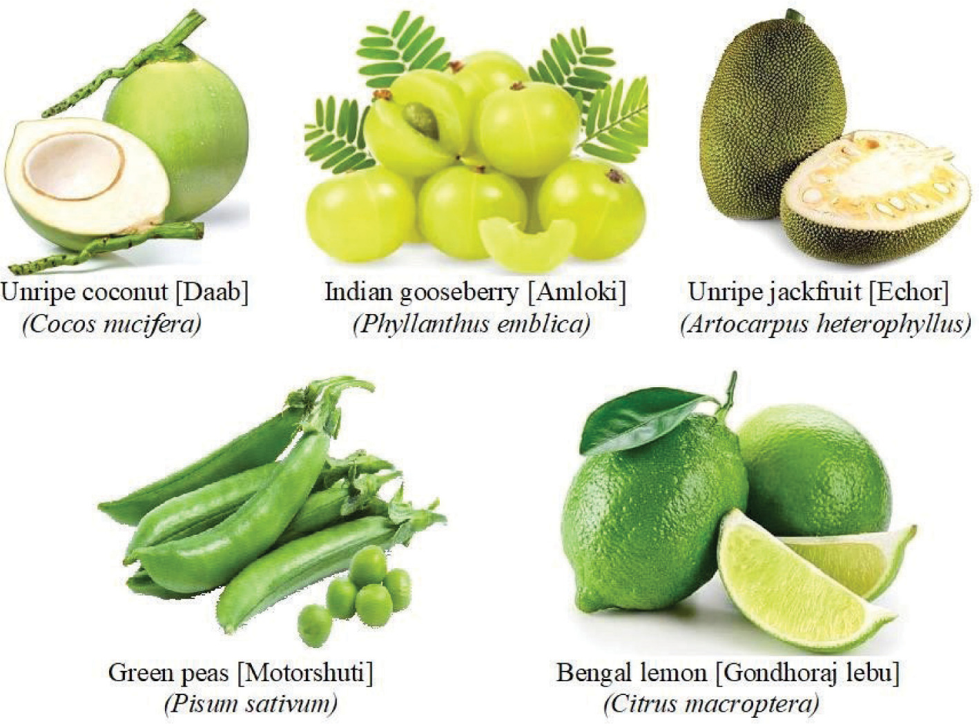The unripe fruits selected for this work which can have well-defined prospects for further investigation in the pharmaceutical field are unripe coconut, green Indian gooseberry, unripe jackfruit, green peas, and Bengal lemon. The pictorial representation of these unripe fruits is given in Figure 1.