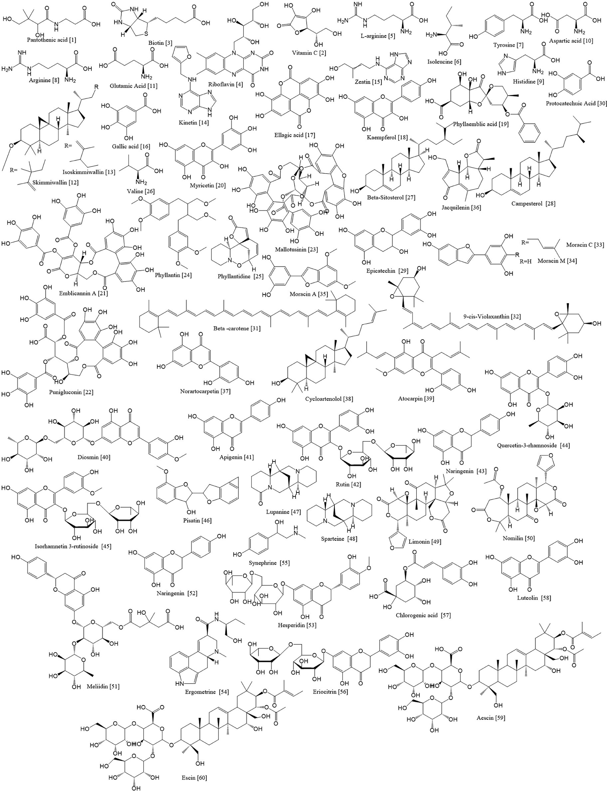 | 2. | Indian gooseberry/Amlaki/Amla (Phyllanthus emblica) | Gallic acid [16], Ellagic acid [17], Quercetin, Kaempferol [18], Phyllaemblic acid [19], Cinnamic acid, Myricetin [20] | Polyphenols, Flavonoids | (Avinash et al., 2024; Chandrika et al., 2005; Dahiya & Dhawan, 2003; Gong et al., 2020; S.Kumar et al., 2017; B.Yang & Liu, 2014) |